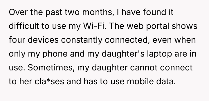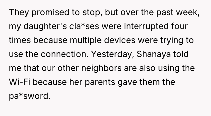 The neighbors demonstrated a pattern of prioritizing their own convenience and potential savings over respecting the OP's established terms and their daughter's educational needs. This behavior shifts the dynamic from a supportive arrangement to one of exploitation. The OP's daughter, whose education is the primary concern, is suffering direct negative consequences due to the lack of reliability on the network.