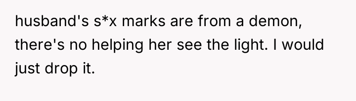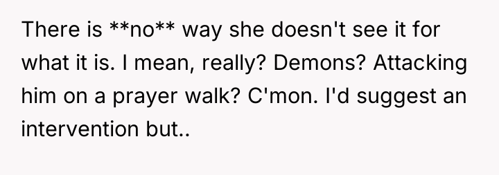 The OP is navigating a complex situation involving deep-seated family belief systems, marital distress, and differing perceptions of reality. Her sister, 'Leah,' appears to be employing cognitive dissonance, using the framework of spiritual attack or 'prayer walks' to rationalize behaviors—such as a year-long lack of intimacy and suspicious physical marks—that strongly suggest infidelity by her husband, 'Jake.' The OP's motivation is clearly rooted in concern, but her direct confrontation, though fueled by observable evidence (scratches), has triggered defensiveness and withdrawal in her sister, indicating a boundary violation regarding Leah's chosen coping mechanism.