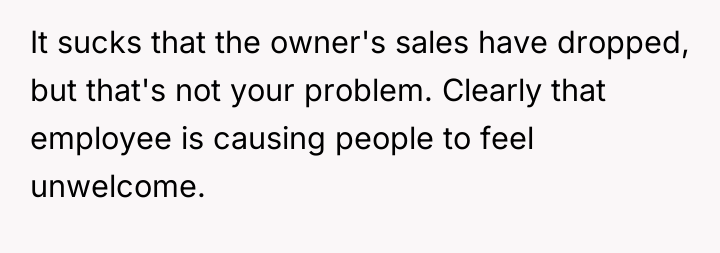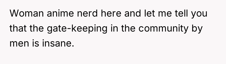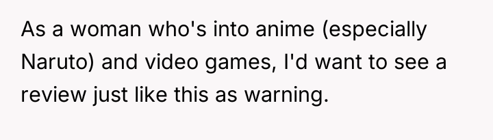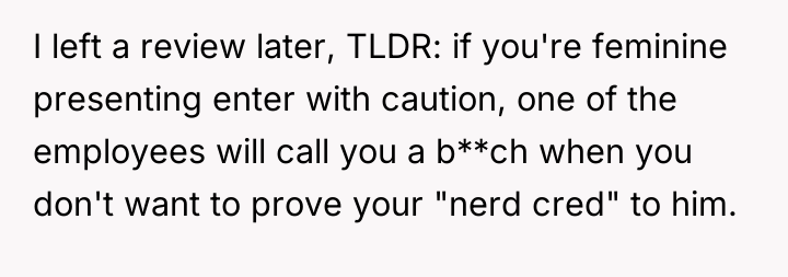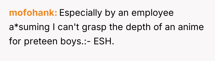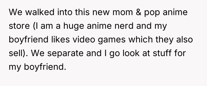 The original poster (OP) faced a confrontation where an employee challenged her knowledge of anime, leading to offensive language from the employee and a subsequent negative review. The central conflict lies between the OP's right to enjoy her hobbies without being tested and the store owner's desire to protect his business reputation and revenue.