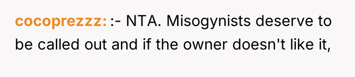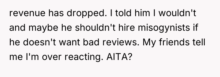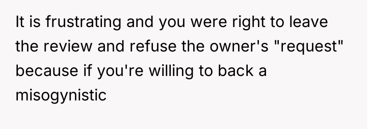 The OP's reaction—standing her ground, dismissing the employee, and later leaving a detailed public review—was a strong assertion of self-respect against harassment and misogyny. While her friends may perceive her reaction as overreacting, her experience involved verbal abuse in a commercial setting. The owner's subsequent actions prioritized damage control over acknowledging the harm done to the customer, further validating the OP's decision to publicize the event.