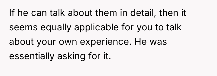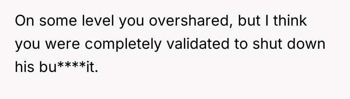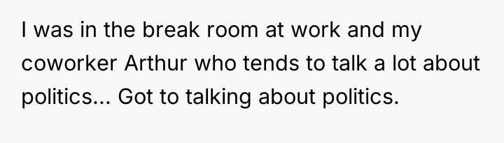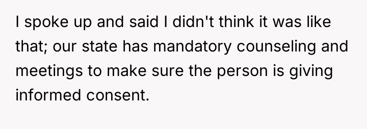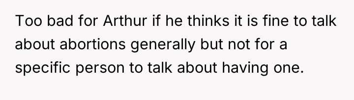 The situation highlights a clash between personal authenticity and professional boundaries. The OP felt compelled to assert accuracy regarding mandatory counseling sessions after Arthur made sweeping, critical generalizations about women making impulsive abortion decisions. When Arthur challenged the OP's initial factual statement, the OP escalated by disclosing a personal medical history to validate their point. While the OP was factually correct about their counseling experience, the workplace break room—intended for relaxation—is generally considered a public space demanding moderate self-disclosure. Arthur initiated the political discussion, which can be seen as a breach of typical workplace social norms, making the OP's subsequent reaction understandable as a defense mechanism against perceived slander or misinformation. However, disclosing specific, personal medical procedures moves beyond defending a policy position into oversharing sensitive personal history.