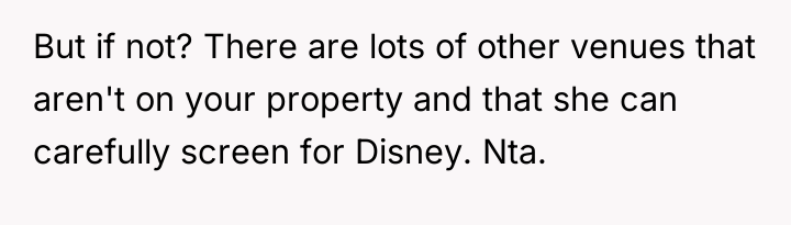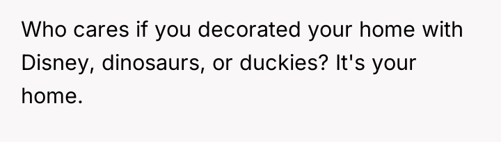 As renowned psychologist Dr. Virginia Satir explains, “We do not do what we do because of what we think and feel. We do what we do because of what we *think* about what we think and feel.” This quote is relevant here because both the sister and the OP are reacting strongly based on their perceived narratives: the sister perceives the Disney decor as 'tacky' and damaging to her event's memory, while the OP perceives the demand as an attack on their personal identity and an overreach of entitlement.