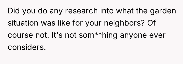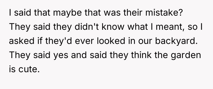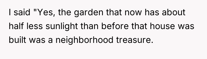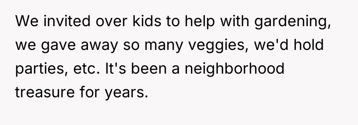 The OP’s action was an understandable reaction to prolonged grief and feeling powerless against city decisions. However, it was not appropriate for fostering a healthy future environment. A more constructive approach would have involved initiating a conversation focused on shared space expectations or acknowledging the difficulty of their situation, rather than delivering a final judgment. Moving forward, the OP should focus on establishing new, positive interactions with the neighbors, perhaps by demonstrating the garden's value in smaller, less antagonistic ways, rather than relying on past history to dictate present interactions.