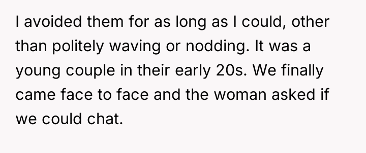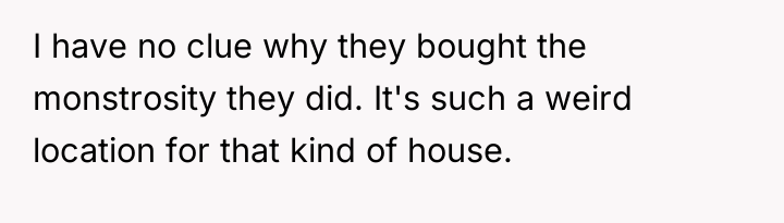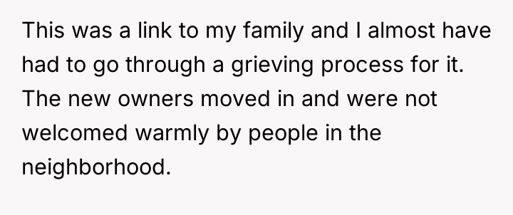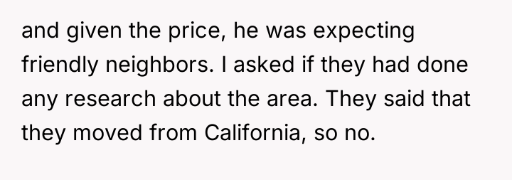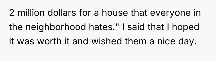 The new neighbors, being young and new to the area, demonstrated a significant lack of due diligence, moving from a different state and seemingly operating under the assumption that high monetary value automatically translates to social capital and community welcome. Their surprise at the cold reception is understandable from a transactional viewpoint, but ignores the context of neighborhood sentiment. The OP's response, while emotionally cathartic for them, was highly confrontational and lacked constructive boundary setting; it served as an aggressive, albeit truthful, expression of grief and resentment rather than an attempt to negotiate future coexistence.