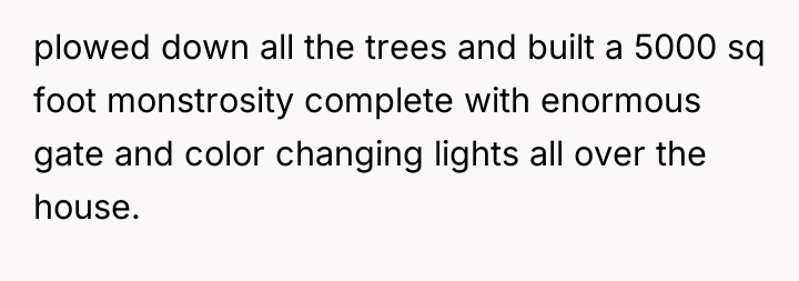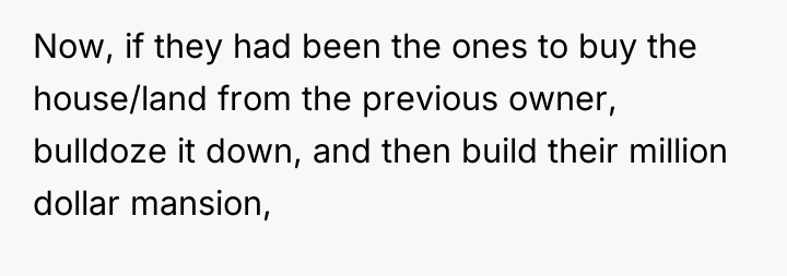 Was the OP justified in confronting the new neighbors with the statement that they 'got what they paid for,' given the destruction of a community asset, or did this reaction unfairly punish newcomers for legal construction? The debate centers on whether property rights and financial status supersede the established emotional and social fabric of an existing neighborhood.
