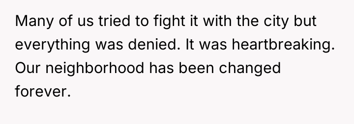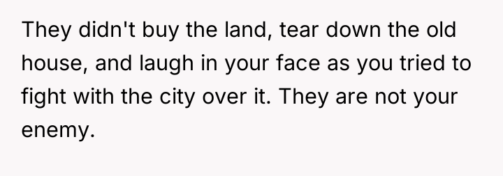 As renowned researcher Dr. Brené Brown explains, “Boundaries are the distance at which I can love you and me simultaneously.” In this scenario, the OP and the neighbors are operating without established, healthy boundaries regarding shared space and community expectations. The developers acted legally, but their action caused a significant intrusion into the OP's emotional landscape, which is a violation of their sense of place and history.