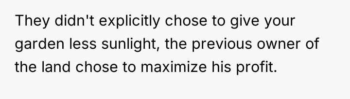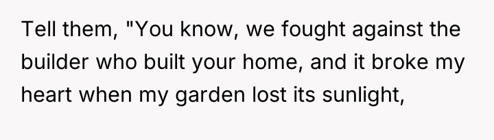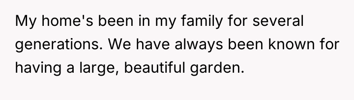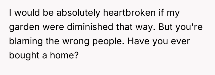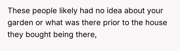 The original poster (OP) is clearly experiencing significant emotional distress rooted in the loss of a long-standing family legacy—the garden—due to new, intrusive development. The central conflict lies between the OP's deeply felt emotional connection to their property and community history, and the new neighbors' transactional expectation of immediate acceptance based solely on their significant financial investment in the area.