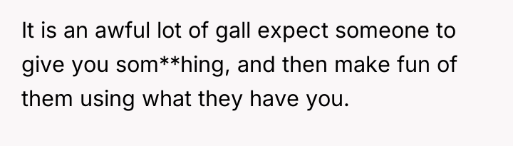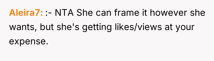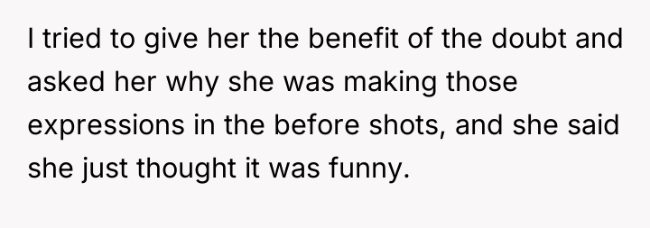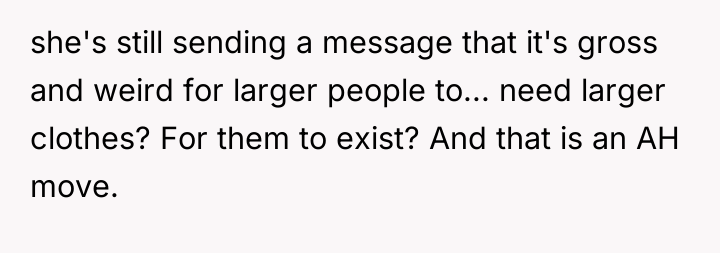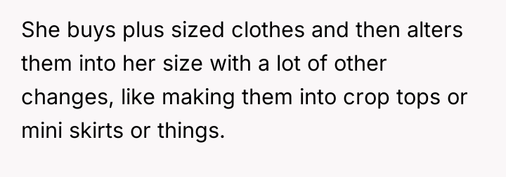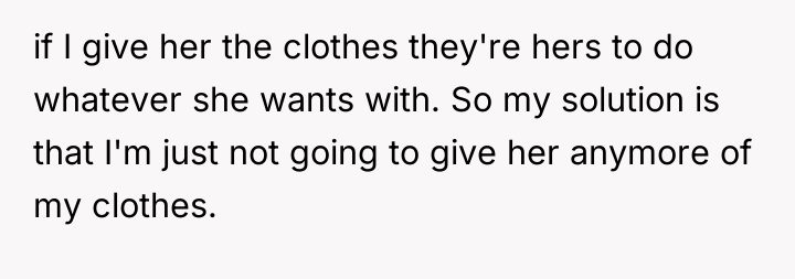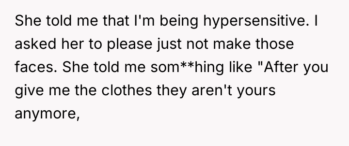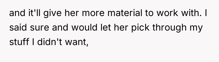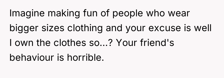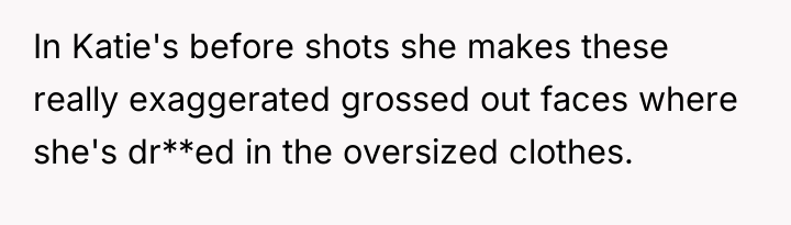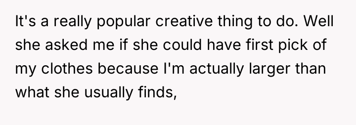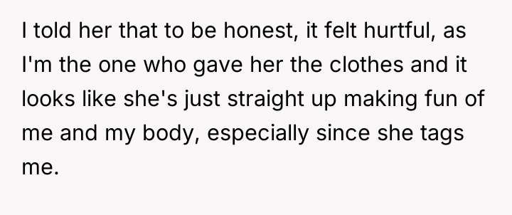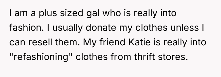 The original poster (OP) initially agreed to give her friend Katie access to her unwanted clothing for creative projects, but this arrangement soured when Katie used highly exaggerated, mocking facial expressions in 'before' photos that seemed to target the OP's plus-sized body. Although the OP initially tried to set a boundary regarding the presentation of the gifted items, Katie dismissed these concerns, asserting complete ownership and control over the items and the OP's feelings.