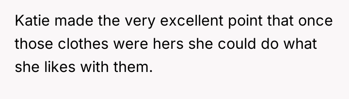 The core conflict lies between the OP's expectation of respect and sensitivity regarding her body image versus Katie's claim of absolute creative freedom over donated property. Was the OP justified in asking for basic respect concerning how the gifted items were presented, or did giving the clothes away truly forfeit all rights to comment on their subsequent use and display?