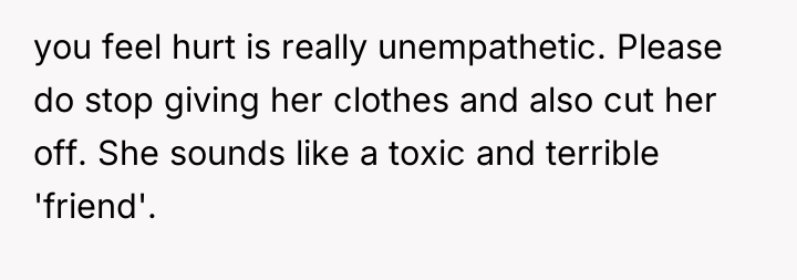 The OP’s final action of ceasing the provision of clothes was an appropriate, albeit reactive, boundary enforcement. A more constructive approach moving forward would involve clearly communicating that continued friendship requires mutual respect, even if it means establishing clearer terms upfront about how gifted items can be used publicly. However, given Katie's dismissive reaction, withdrawing the resource (the clothes) was the most immediate way for the OP to protect her emotional well-being.