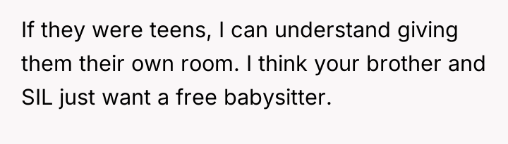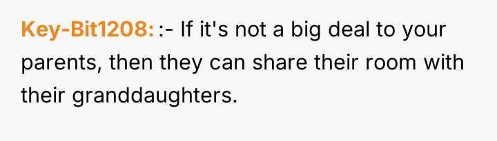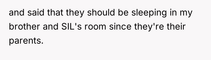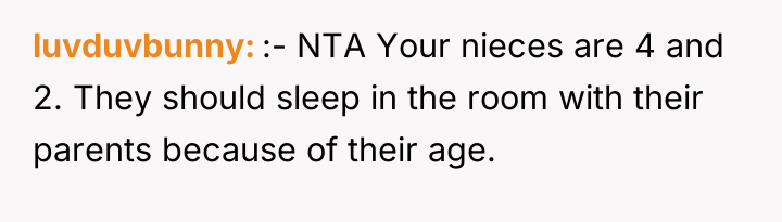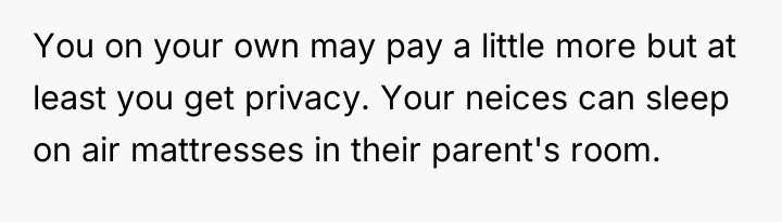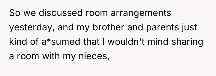 The original poster is facing strong emotional pressure from their family who expect them to accept a less desirable sleeping arrangement involving sharing a room with young nieces, viewing the OP's request for personal space as unreasonable. The central conflict lies between the OP's firm boundary setting for personal privacy and the family's assumptions based on perceived familial roles and expectations regarding who should accommodate the children.