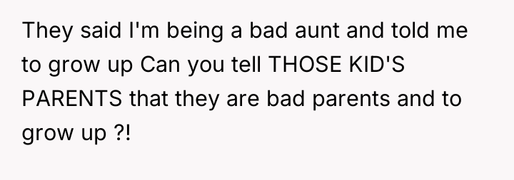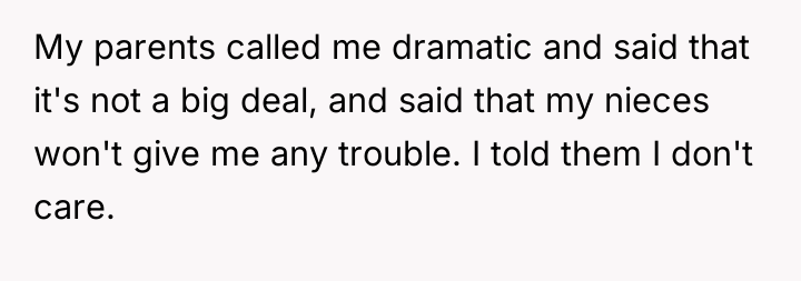 The family's reaction—labeling the OP as 'dramatic,' a 'bad aunt,' and a 'narcissist'—is a classic example of emotional manipulation often used to enforce compliance when personal boundaries are asserted. The parents' insistence that the nieces 'won't give [the OP] any trouble' dismisses the OP's emotional labor requirement and right to privacy, regardless of the children's behavior. The brother’s response further escalates the conflict by resorting to name-calling rather than engaging with the request logically.