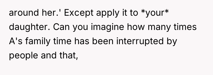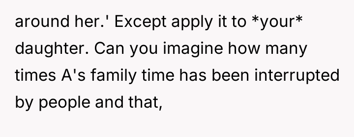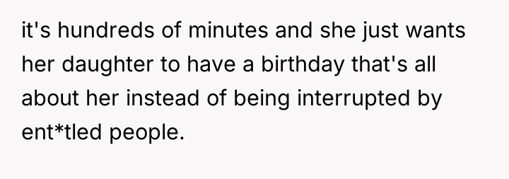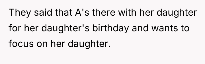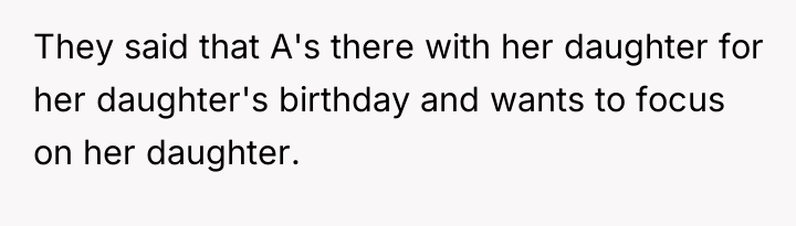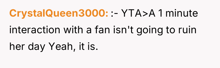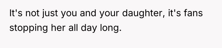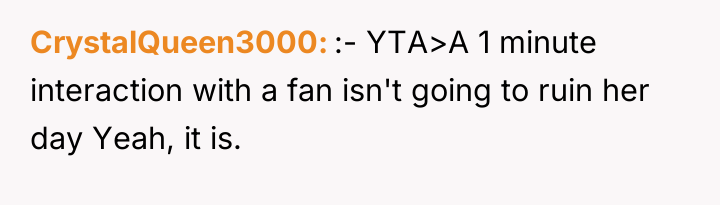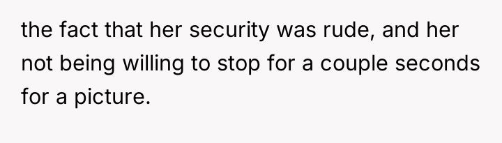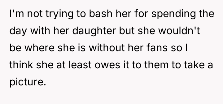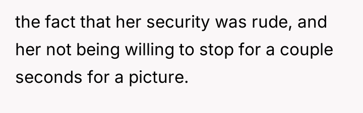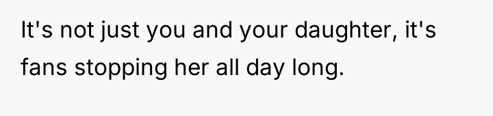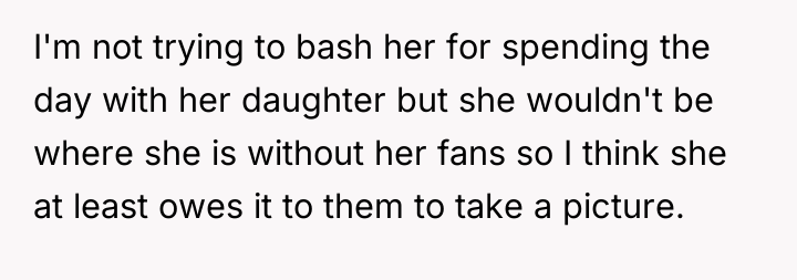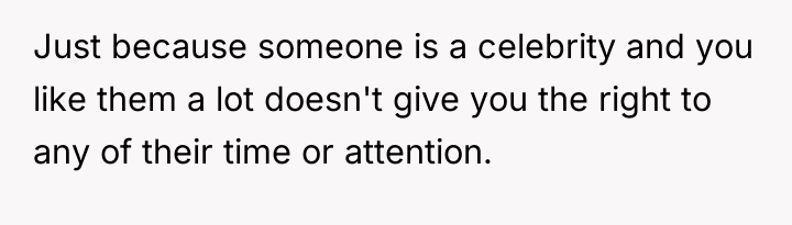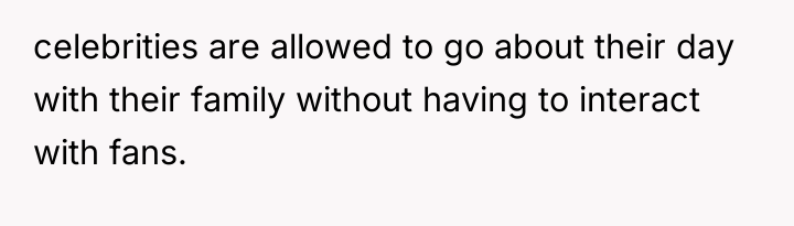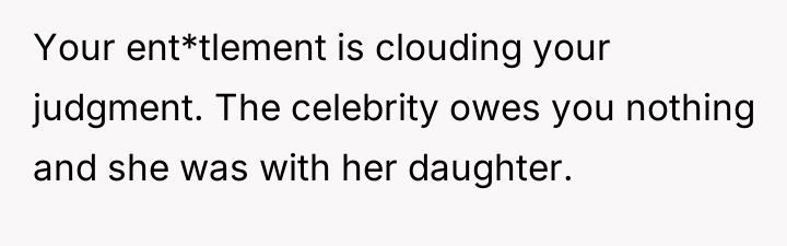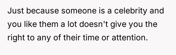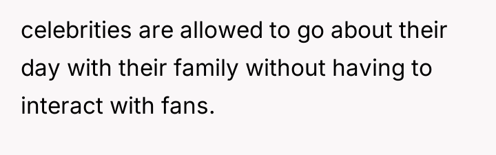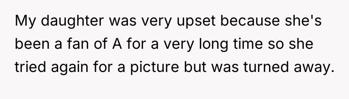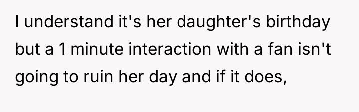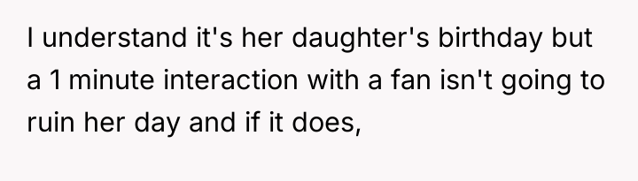 The core issue here involves the imbalance of perceived obligation between a fan and a celebrity, complicated by a highly sensitive context—a child's birthday. The OP's action of posting online stems from a place of defending her daughter's emotional disappointment, framing the celebrity's boundary-setting as rudeness and entitlement. However, the celebrity, in this instance, established a clear, reasonable boundary: prioritizing her daughter during a special occasion. Security personnel reinforcing this boundary, even if perceived as abrupt, acted within their role to protect the celebrity's private time. The OP's belief that a celebrity 'owes' interaction discounts the celebrity's right to personal space and family time, suggesting a transactional relationship where fandom demands personal access.