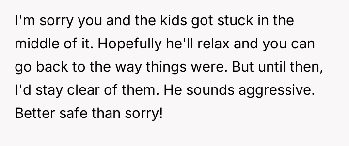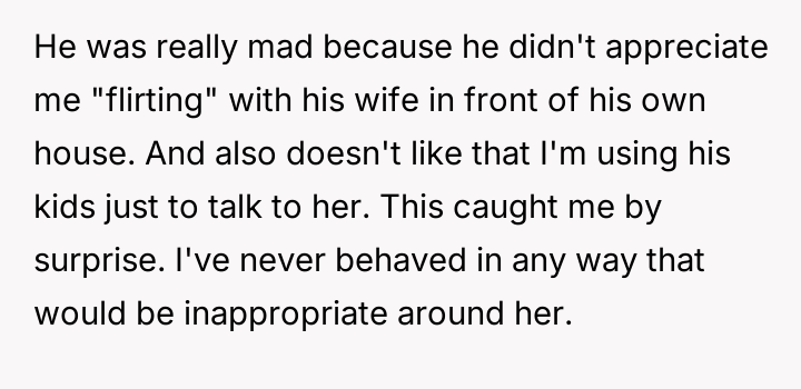 The OP acted kindly by sharing his hobby and spending time with the children, establishing a positive initial rapport. However, the father perceived the OP's friendly interactions with the mother as inappropriate 'flirting,' triggering a defensive and hostile reaction. The OP's motivation in distancing himself was appropriate—respecting the direct instruction from the neighbor. The subsequent error occurred when the OP chose to disclose the private conversation to the mother. While seemingly done to prevent her from feeling rejected by the OP, this action breached the boundary set by the father and inserted the OP into the couple's private dynamic, which directly resulted in the escalation the OP was trying to avoid.