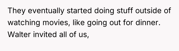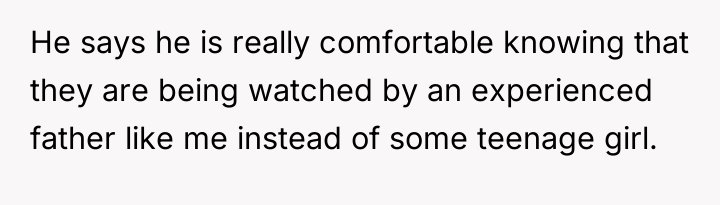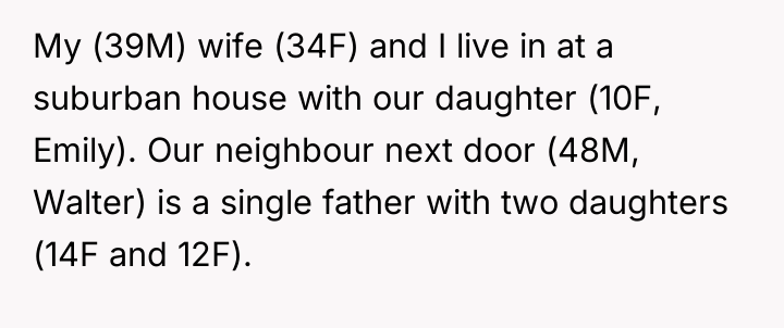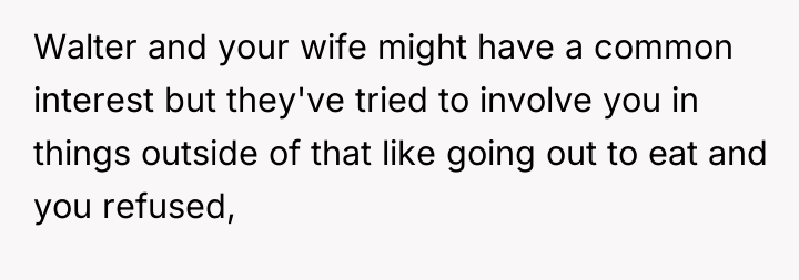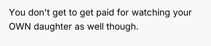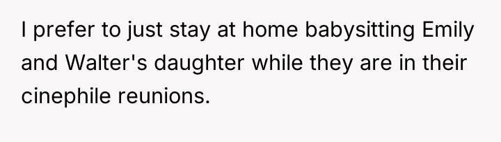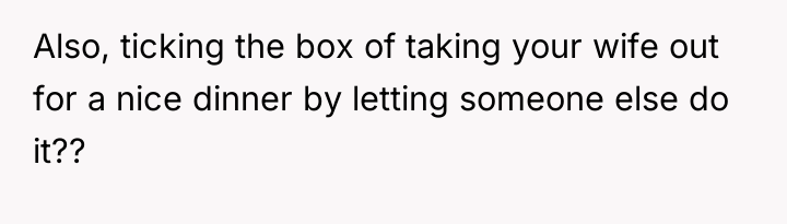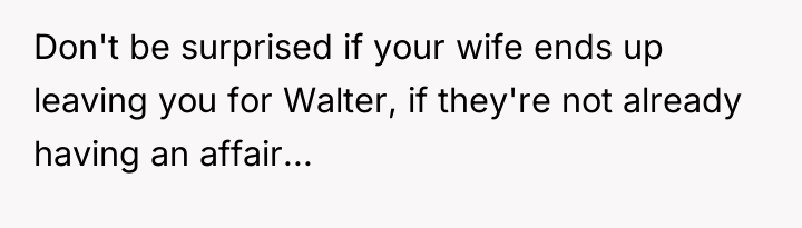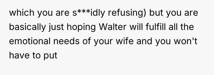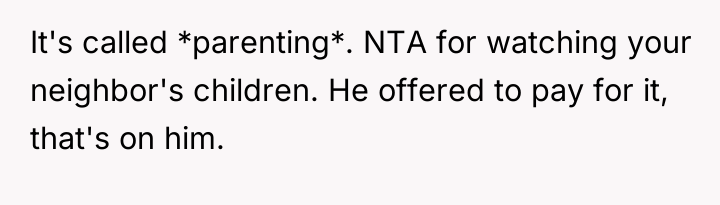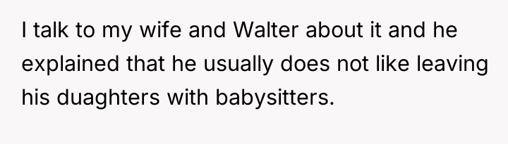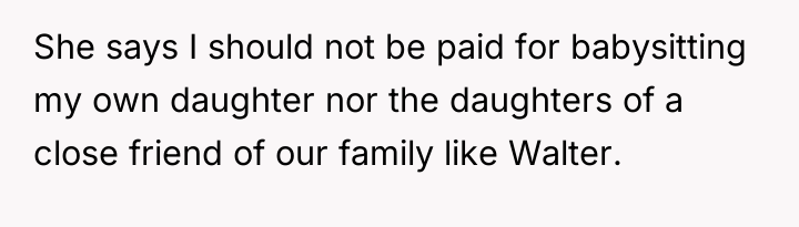 Walter’s offer to pay the OP is an attempt to formalize and compensate for the extra burden, which is a practical solution to an equity problem. The OP’s willingness to accept this acknowledges that his time and effort have tangible value, shifting the interaction from a casual favor to a transactional exchange of services. The wife’s opposition to payment suggests an unspoken expectation rooted in reciprocity within their social circle—that looking after a close friend’s children should be an act of goodwill, not a paid job. Her anger likely stems from feeling that accepting payment devalues their friendship with Walter or potentially implies she is taking advantage of the OP.