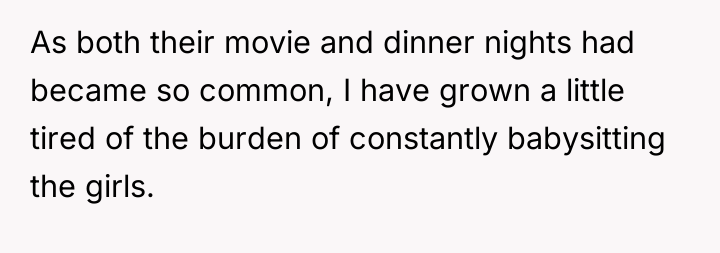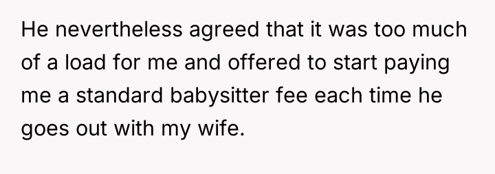 The OP’s actions of staying home and babysitting were initially accommodating, but the consistency turned this accommodation into an unfair expectation placed upon him. The OP was appropriate in raising the issue of burnout. A constructive recommendation is for the couple to move away from transactional solutions (payment) or rigid refusal (no payment) and instead focus on achieving *equity* in shared domestic and social duties. They need a structured discussion where the OP clearly defines his boundaries regarding free time and childcare labor, ensuring that the wife’s enjoyment of her hobby does not continuously cost the OP his personal time.