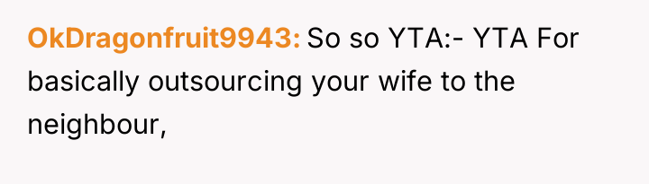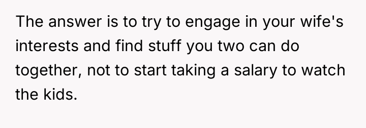 The original poster (OP) is experiencing distress due to the perceived imbalance of responsibilities, specifically feeling overwhelmed by consistently babysitting his neighbor's children while his wife pursues shared niche interests with the neighbor. The central conflict arises from the OP accepting financial compensation for this extra childcare effort, which his wife strongly opposes based on principles of familial expectation and friendship etiquette.