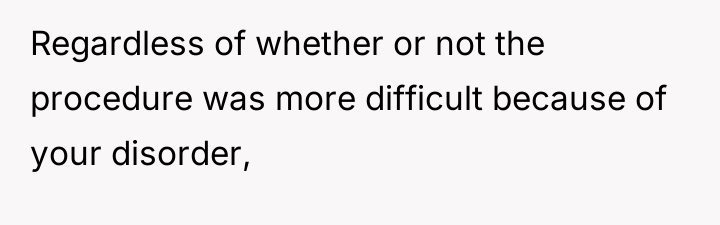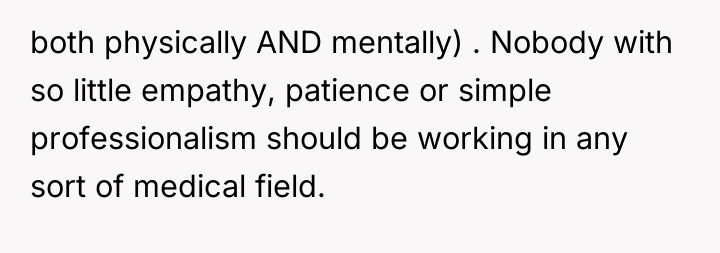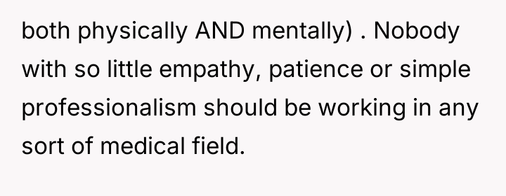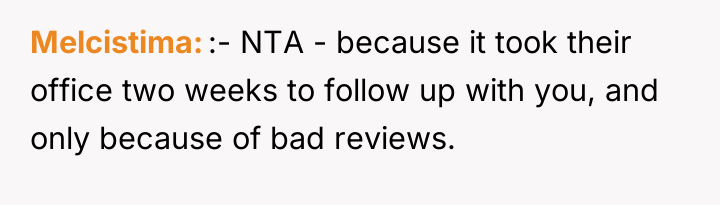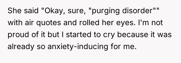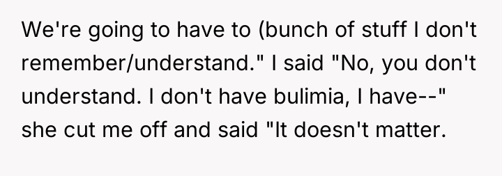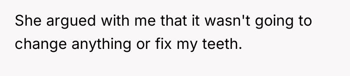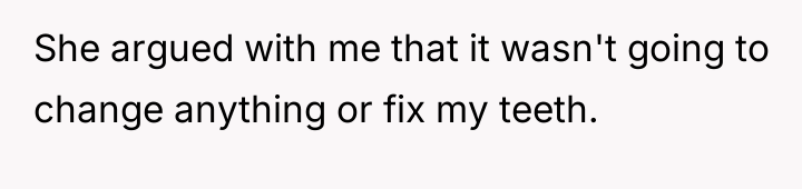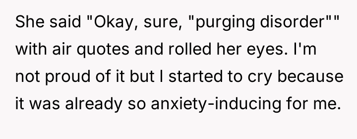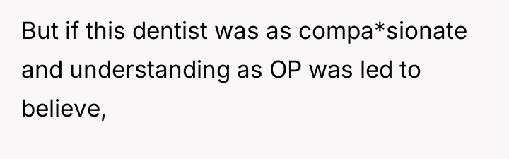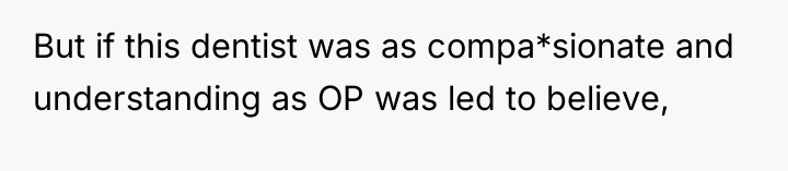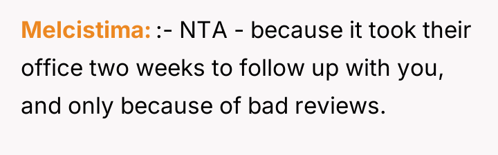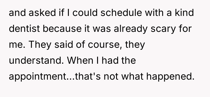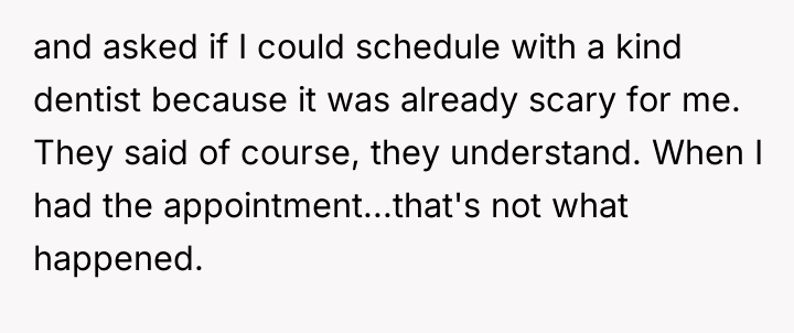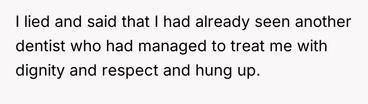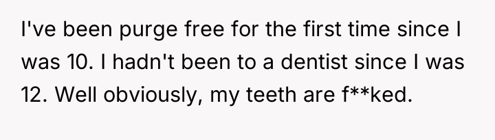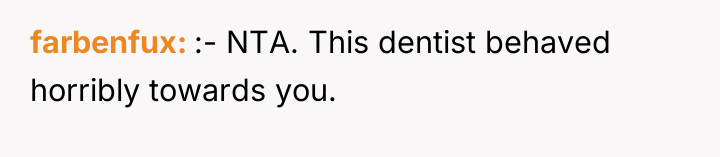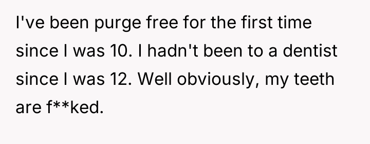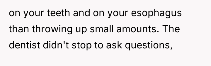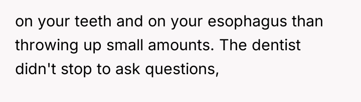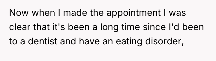 The original poster (OP) faced a deeply distressing and invalidating experience when seeking necessary dental care for health issues stemming from a long-term eating disorder. The central conflict lies between the OP's need for compassionate, informed medical treatment and the dental professional's dismissive, judgmental response, leading the OP to feel humiliated and fight back publicly through reviews.