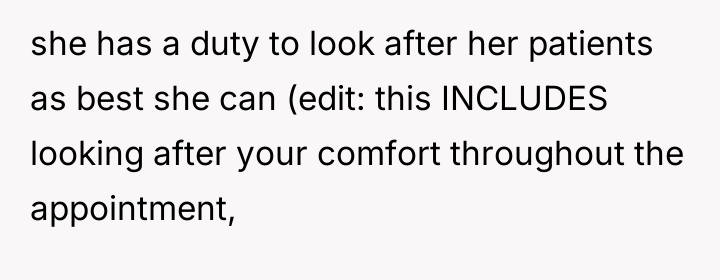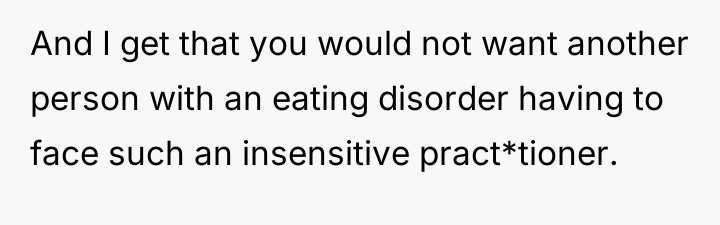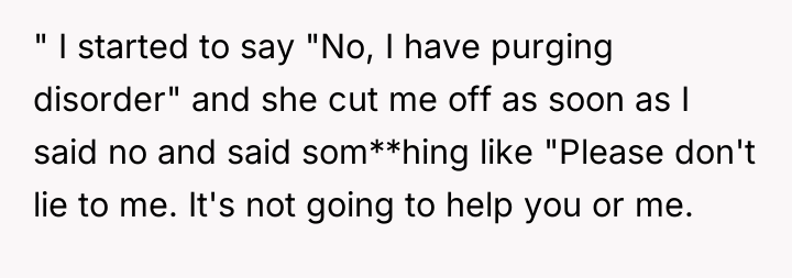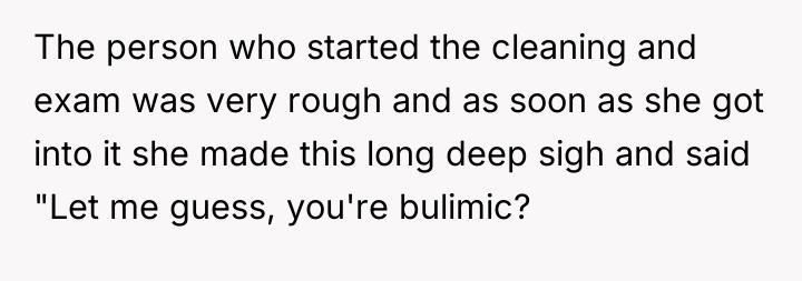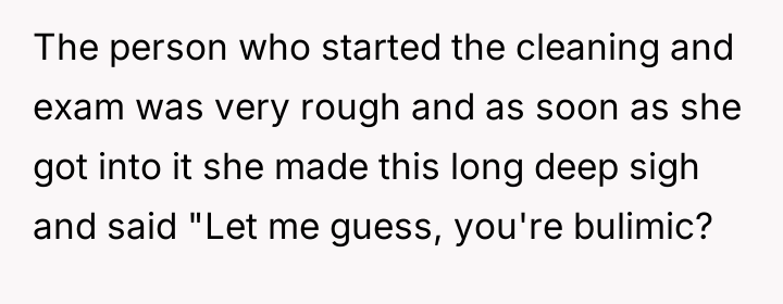 The key issue here is clinical competence extending beyond physical treatment to include emotional intelligence and trauma-informed care. Eating disorders, regardless of subtype, carry immense shame. The hygienist’s immediate assumption, dismissal of the OP's correction, and use of non-verbal cues like eye-rolling signaled a profound lack of training in patient communication regarding sensitive health issues. The practice's subsequent attempt to manage the negative reviews rather than address the core complaint demonstrates a focus on reputation management over internal accountability and patient safety.