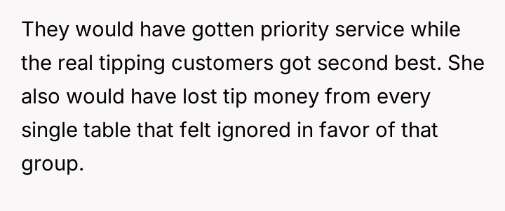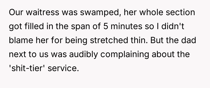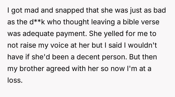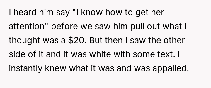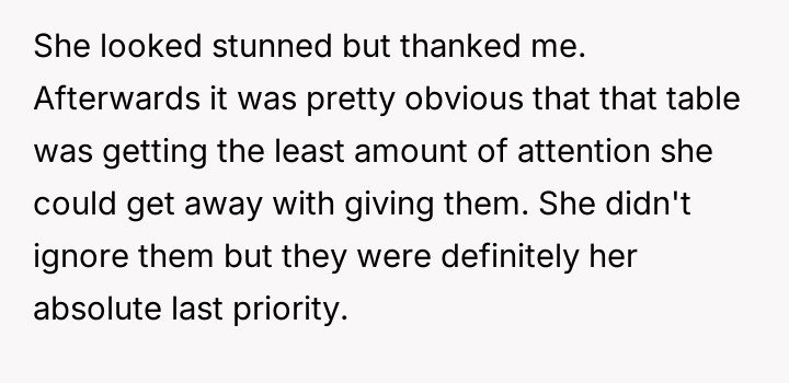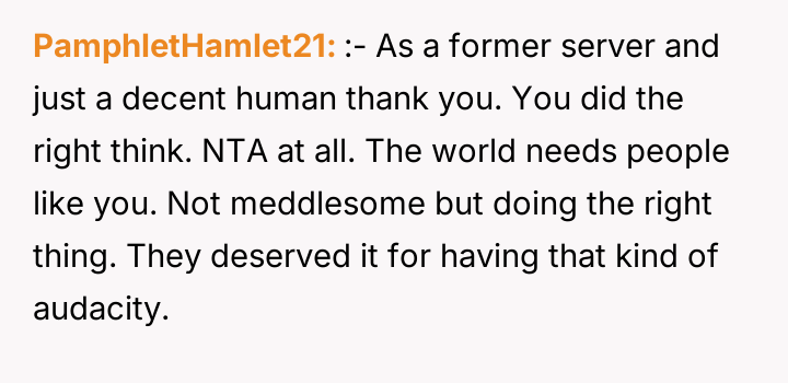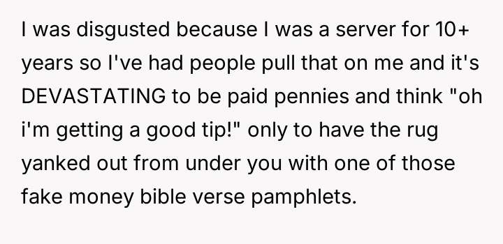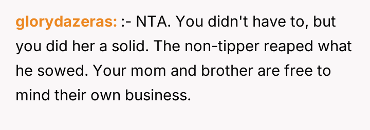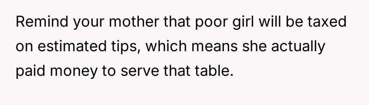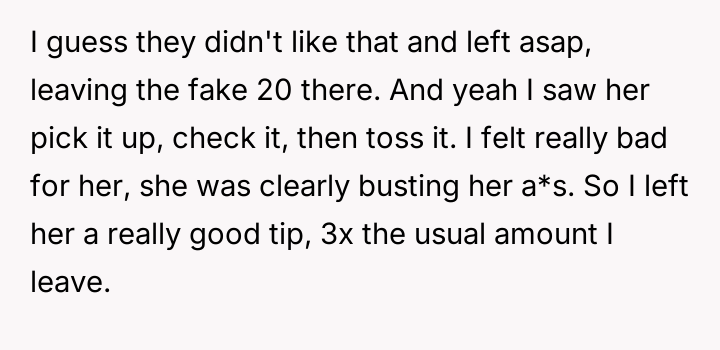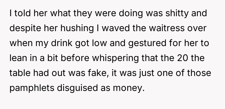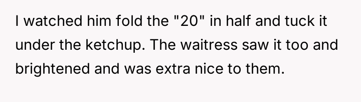 The OP's motivation stemmed from a place of empathy and a desire to protect a vulnerable service worker from emotional harm—a common reaction for those who have experienced similar exploitation. By intervening, the OP established a strong boundary around acceptable behavior in a public setting, particularly concerning labor exploitation. However, this action also crossed a boundary within the family unit, as the mother viewed the intervention as inappropriate meddling, leading to conflict. The father’s action of leaving the fake tip is a clear breach of social contract and professional courtesy, designed to manipulate the service environment. The OP’s subsequent argument with the mother escalated the situation from an external moral issue to an internal relational conflict.