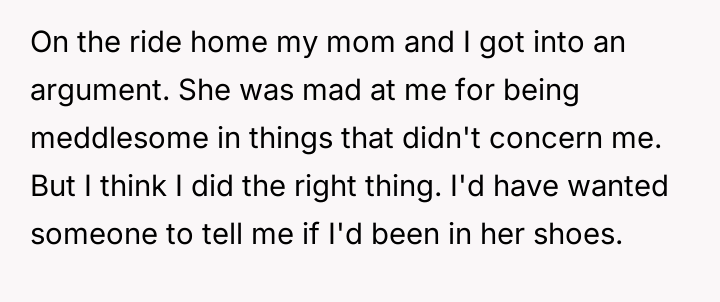 Caught in the crossfire of frustration and empathy, the child faced a choice: to stay silent or to intervene. What unfolded was a test of conscience, challenging the boundaries of minding one's own business and standing up against injustice, leaving both mother and child to grapple with the true meaning of right and wrong in a world that rarely offers easy answers.