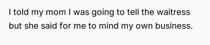 Was the OP correct to prioritize the waitress's well-being by exposing the deceptive action, even if it meant causing a scene and arguing with their mother, or should the OP have followed the advice to mind their own business, prioritizing social harmony over correcting a perceived injustice?
