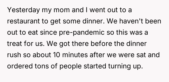 In a quiet moment meant for connection, a mother and child stepped out for a rare dinner, hoping to savor more than just food — a brief escape from the pandemic's shadow. But their evening was quickly overshadowed by chaos and discomfort, as a nearby family's unruly behavior and a father's harsh complaints disrupted the fragile peace, igniting an unexpected moral dilemma.