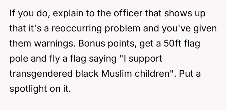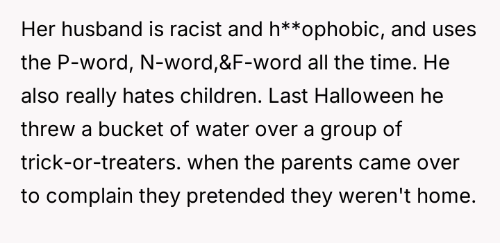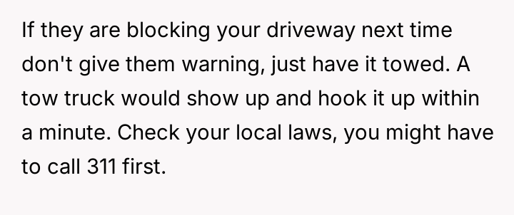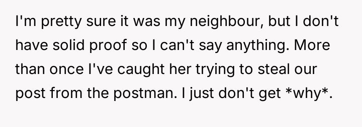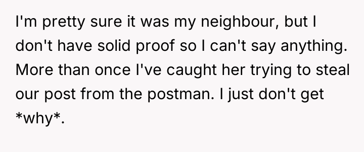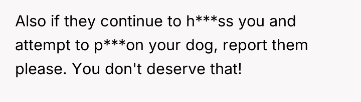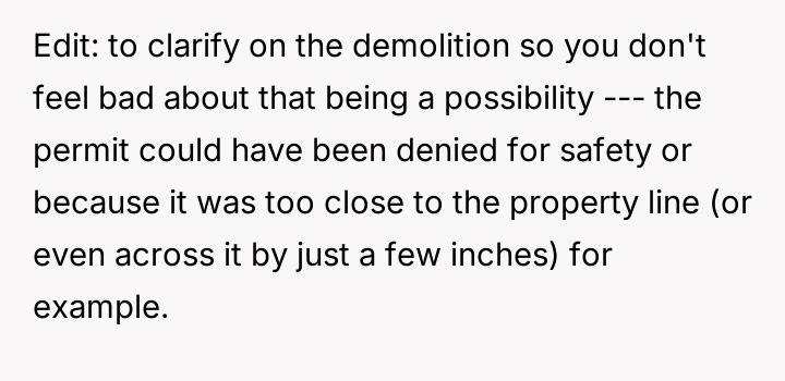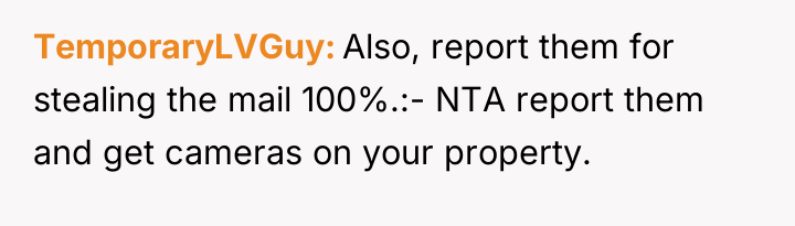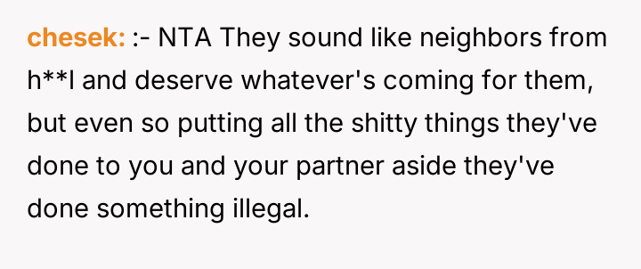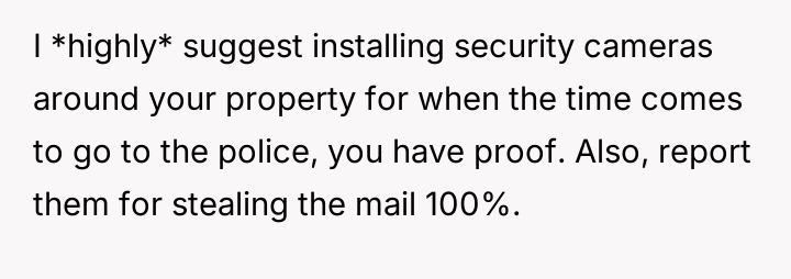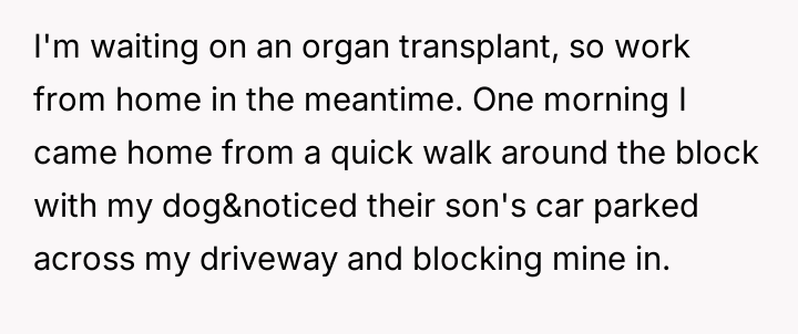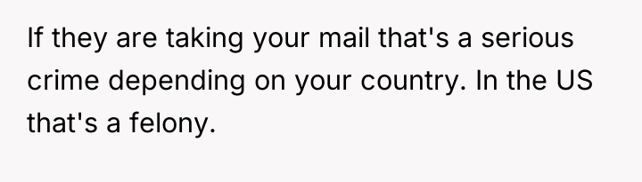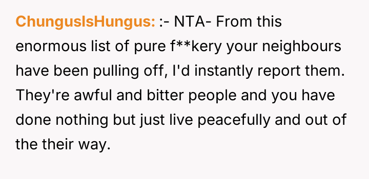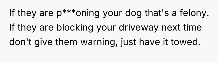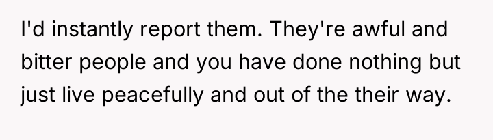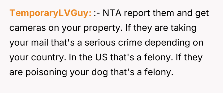 The neighbors’ motivations seem rooted in deep-seated resentment, likely stemming from envy over the OP's home ownership at a younger age, combined with inherent prejudices exhibited by the husband. Their actions—insulting remarks, blocking the driveway (a clear threat to someone with a medical condition), false accusations about the dog, and mail tampering—are escalating acts of harassment designed to assert dominance and cause distress. The OP's desire for retribution by reporting the illegal extension is an understandable, though emotionally driven, response to years of feeling victimized and powerless. Reporting the illegality shifts the power dynamic decisively.