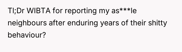 The Original Poster (OP) is facing persistent, hostile behavior from their elderly neighbors, including harassment related to their health, property, and possessions. The OP is currently in a conflict where they possess evidence of the neighbors' illegal home extension and property damage, presenting a moral dilemma about whether to seek official recourse for years of mistreatment.