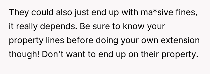 Reporting the illegal extension is a legally sound, though emotionally charged, action when property damage is involved. A more constructive long-term strategy, if legal action is taken, involves maintaining meticulous documentation of all future interactions and establishing very clear, non-emotional boundaries. For future conflicts, the OP should prioritize health and safety communication over confrontation, immediately involving authorities (police/local council) for documented offenses rather than engaging directly with the hostile neighbors.