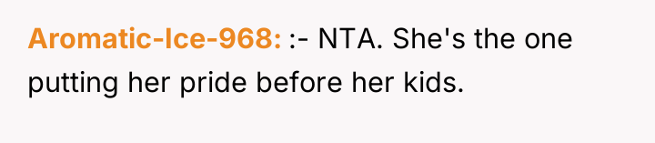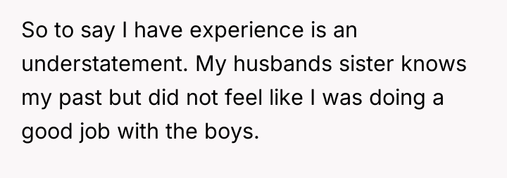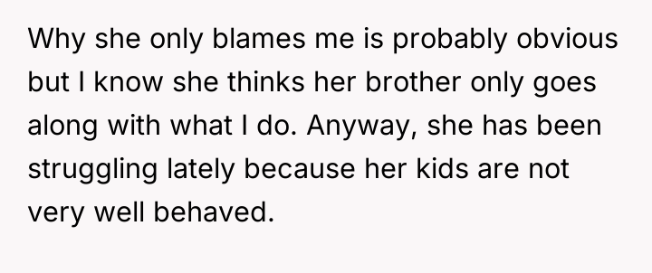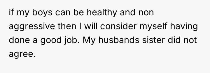 The original poster (OP) is deeply invested in raising kind, emotionally open sons, a parenting style stemming from a difficult childhood where she had to take on a maternal role early. Her conflict arises from her sister-in-law's severe criticism, which implied the OP's methods were making her sons 'soft' and setting them up for failure. The OP's refusal to help her sister-in-law now stems directly from the sister-in-law's past insults and lack of apology, creating a standstill where family obligation clashes with self-respect.