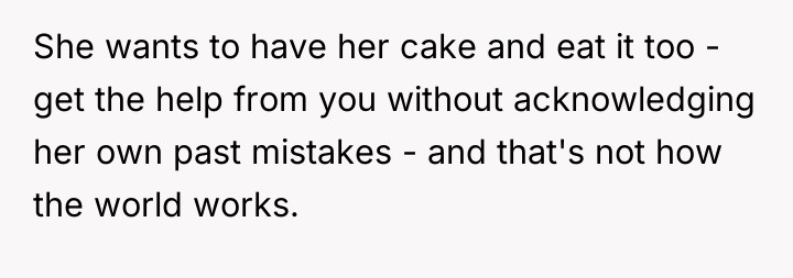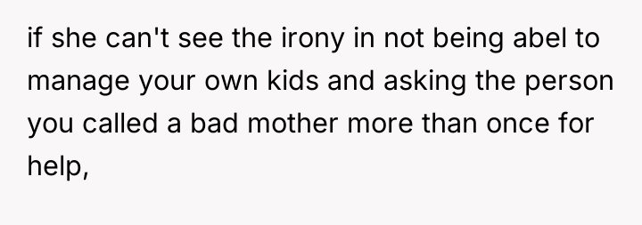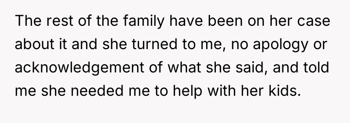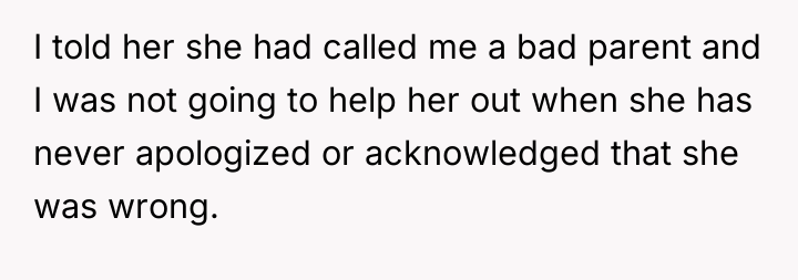 Should the OP prioritize repairing the familial relationship by offering help despite the past disrespect, or is maintaining firm boundaries and demanding accountability for the severe judgment more important for her mental well-being and future interactions? The central question remains: Does family obligation supersede the need for an apology after significant character criticism regarding one's children?