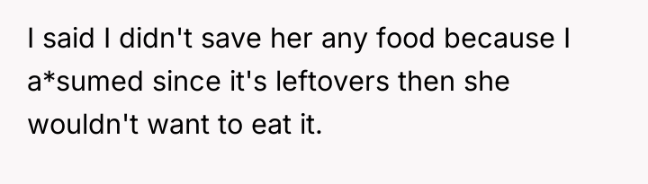 The OP’s actions, while practical from a resource management perspective (he cooked for himself and assumed her known preference), lacked proactive communication and empathy for her emotional state. By not confirming if she needed a portion saved, he defaulted to an assumption based on past behavior, which resulted in an unintended punishment (her going hungry). His response to her tantrum—labeling her as childish—further escalated the conflict rather than de-escalating it, revealing a breakdown in respectful communication when under stress.