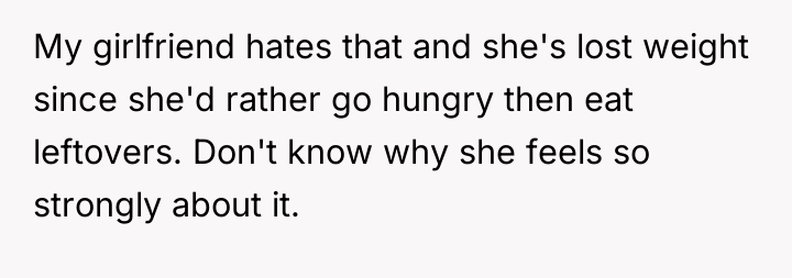 The original poster (OP) is facing a difficult situation where financial constraints clash with his girlfriend's strong aversion to eating leftovers, leading to conflict and one person going hungry. The central issue is the OP's attempt to manage limited resources by relying on leftovers, which conflicts with the girlfriend's deeply held, though unexplained, feelings about food freshness and status.