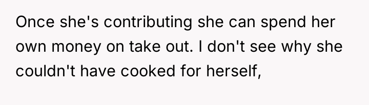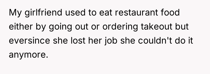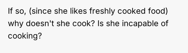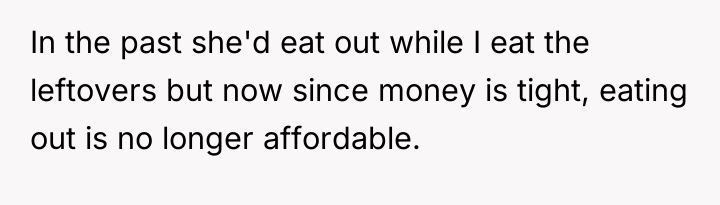 Given the necessity of managing their shared budget, was the OP justified in prioritizing his own immediate need for a pre-prepared meal, or did his assumption about her preference override his responsibility to ensure his partner had food, even if it meant cooking a fresh meal? The core question remains: How should a couple balance financial realities against strong personal habits and expectations around basic needs like food?