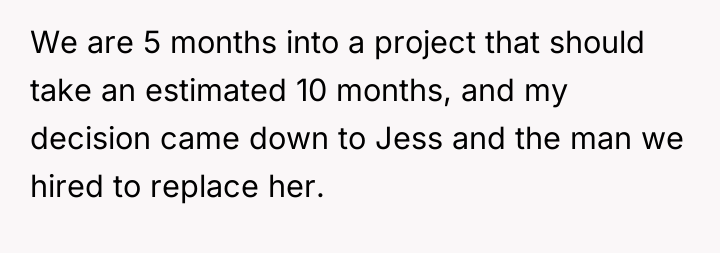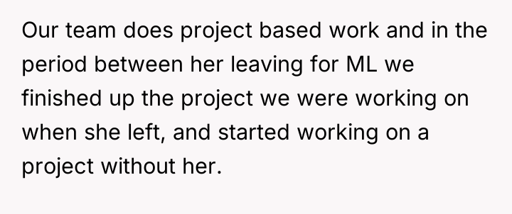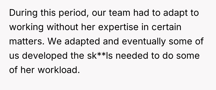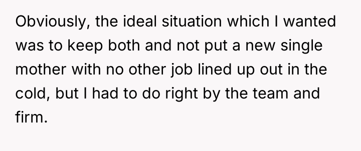 Was the team leader's decision, based on financial efficiency and project continuity, justified when weighed against the obligation to retain a long-term employee returning from legally protected leave, or did this action demonstrate a failure to support an employee during a crucial life transition? The debate centers on the balance between corporate expediency and employee loyalty.