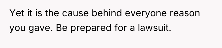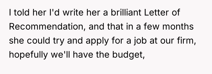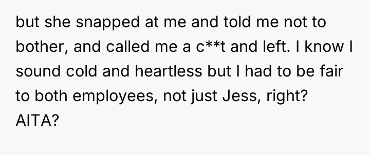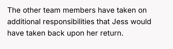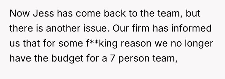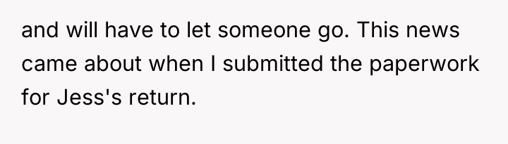 The abrupt firing upon return, regardless of the justification, triggers significant emotional responses, as seen in Jess's reaction. A more constructive approach would have involved earlier, more transparent communication regarding potential budgetary constraints, perhaps exploring alternatives like a phased return or temporary reduced role, rather than presenting the termination as an immediate consequence of her paperwork submission. Moving forward, when long-term leave is involved, managers should establish clear communication channels about evolving project needs well in advance of the return date to mitigate the shock and potential legal exposure associated with what appears to be a termination masked as a necessary layoff.