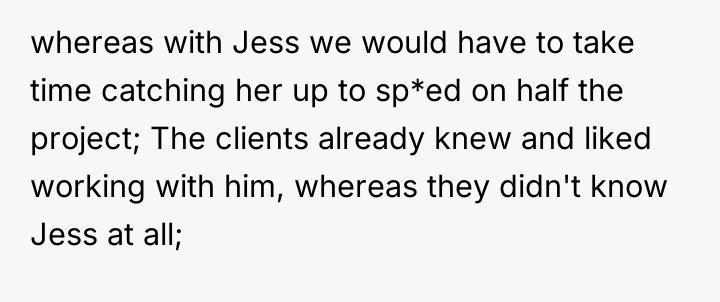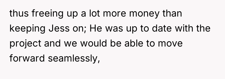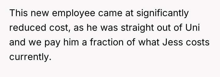 The manager's decision process appears heavily weighted toward operational efficiency and cost management, which are valid business concerns. The justifications—lower salary cost, immediate project alignment, and proven team fit of the replacement—are compelling from a purely short-term logistical standpoint. However, relying on the fact that the team successfully adapted during Jess's absence, coupled with the simultaneous hiring of a cheaper replacement, suggests an inherent devaluation of Jess’s prior role and investment in the company. While the manager states the decision was 'fair to both employees,' fairness in this context must also consider the implied contract of returning after maternity leave, which carries an expectation of job security, even if the business context shifts.