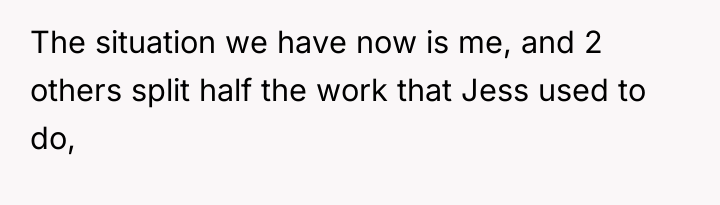 The team leader is struggling with the guilt of letting an experienced employee, Jess, go after her extended maternity leave, despite having hired a cheaper, current replacement. The central conflict lies between the leader's business decisions, which prioritized cost savings, project momentum, and team integration, and the significant personal impact these decisions had on Jess, who lost her job upon return.