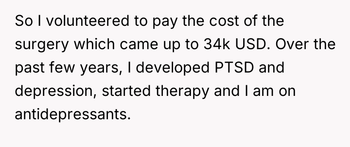 The initial act of paying the $34k surgery cost, while seemingly compassionate, set a dangerous precedent. The parents have perceived this gesture as an admission of open-ended liability, shifting from a victim/responsible party dynamic to a long-term financial arrangement. The OP's continued psychological distress (PTSD, depression) confirms that the accident remains an active trauma, and the parents' current demands are reactivating that trauma loop. Legally, the OP was cleared, and paying the initial cost was an act of goodwill, not liability. Ethically, setting firm boundaries is essential when dealing with trauma; continuing to fund the situation allows the external pressure to override the OP's own therapeutic recovery needs.