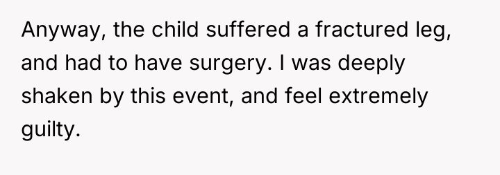 The original poster is grappling with immense guilt and the lingering psychological effects of a serious accident that occurred five years ago, even after taking significant financial responsibility for the child's initial injury. The central conflict now lies between the OP's personal boundary, established after refusing further financial demands, and the parents' insistence that the OP owes them support for the child's subsequent, related medical complications.