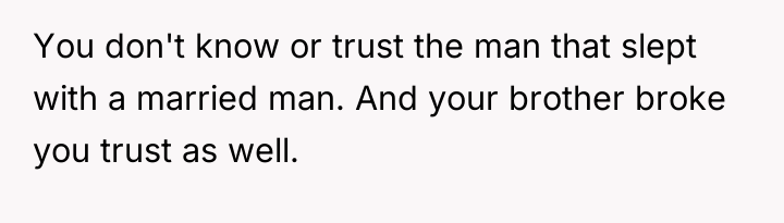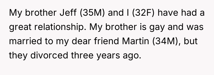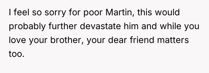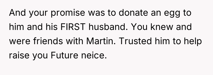 The original poster (OP) is caught between a promise made to her brother, Jeff, regarding egg donation for a future child, and her strong loyalty to her friend, Martin, who was deeply hurt by Jeff's swift departure and remarriage. The central conflict lies in the OP's moral objection to fulfilling a promise rooted in a relationship that was broken by infidelity, despite intense pressure from her family and husband to honor the commitment.