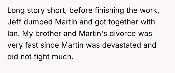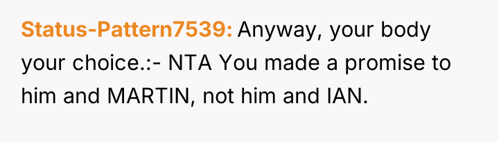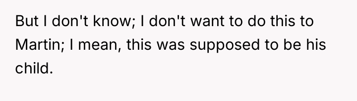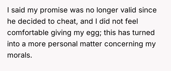 The OP's decision to withhold her genetic material based on changed circumstances is appropriate from a standpoint of personal integrity and boundary setting, especially since the arrangement was never legally finalized with required medical steps. A constructive way to handle this moving forward would be for the OP to communicate clearly, perhaps with the aid of a neutral third party or therapist, that while she values her relationship with Jeff, the foundation of the original agreement has been irrevocably damaged. She should firmly state that she cannot proceed with the donation because the arrangement no longer supports the well-being of Martin, who was meant to be the other parent.