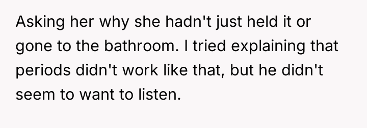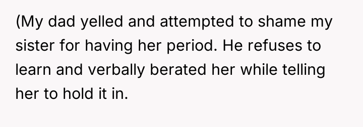 The father's reaction to the accidental bleeding incident displays a profound lack of emotional maturity and education regarding female biology, which is unacceptable given the circumstances. The OP’s outburst, while aggressive, was a direct response to seeing his father fail his daughters in a fundamental way, using the mother's absence as an excuse for inaction. The aunt's intervention further complicated matters by dismissing the OP's unique emotional labor and lived experience, thus invalidating his resentment.