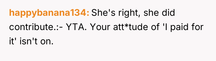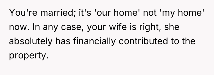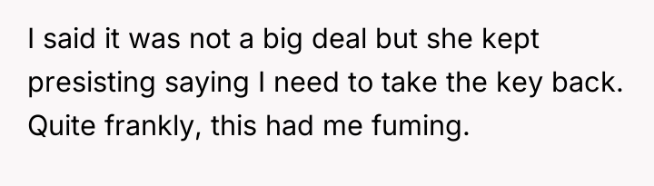 The husband's perspective focuses on property rights and trust in his mother, seeing the key as a practical safety measure. His reaction—becoming 'fuming' and stating 'end of story'—suggests a defensive reaction to what he perceives as an attack on his autonomy, possibly overlooking his wife's underlying emotional stake in their shared residence. The wife's argument, while partially referencing her past financial contributions, centers on feeling 'uncomfortable' and needing to be included in decisions about who accesses their home. Her threat to take the key back signals a breakdown in communication regarding joint decision-making, transforming a practical request into a power struggle over respect and security within the marriage.