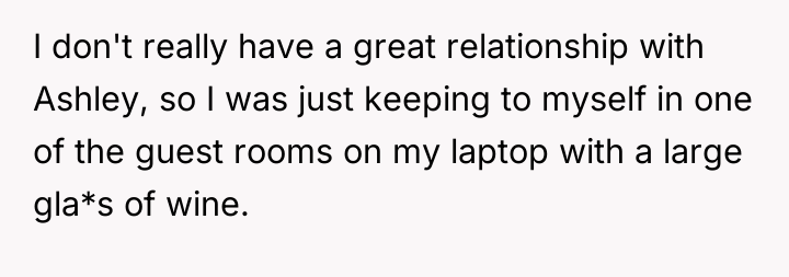 Tension hung thick in the air as she sat alone in the guest room, the weight of family drama pressing down on her chest. Surrounded by silence and the faint clink of ice in her wine glass, she wrestled with unease—not just about the looming conversations downstairs, but about the fragile trust between her and Ashley, the goddaughter she barely knew.