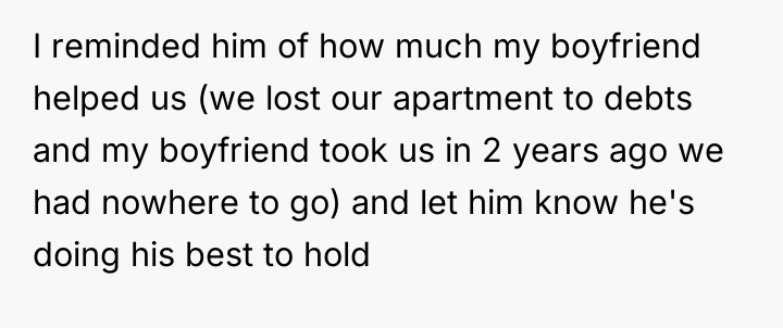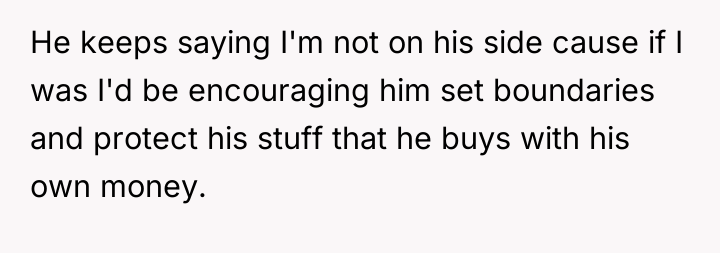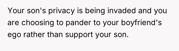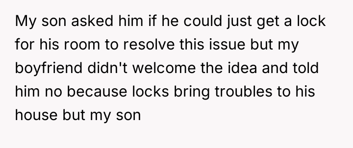 This situation clearly illustrates a failure in establishing and enforcing effective boundaries within a blended family structure. The boyfriend's refusal to allow a simple lock, citing abstract 'troubles' and imposing an arbitrary age limit (18), suggests a resistance to acknowledging the biological son's individual autonomy. His justification seems rooted in maintaining control or avoiding perceived complexity rather than promoting mutual respect. The OP's motivation to side with her boyfriend stems from gratitude and reliance (being taken in after financial hardship), creating a power imbalance where her son feels unsupported. When the OP sides with the boyfriend, she inadvertently teaches her son that his need for dignity and personal space is secondary to maintaining the peace or pleasing the authority figure, which can erode trust significantly.