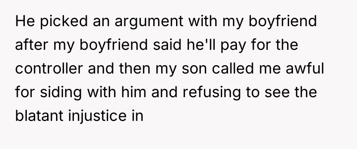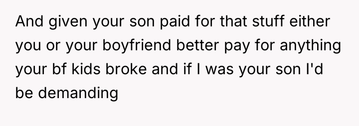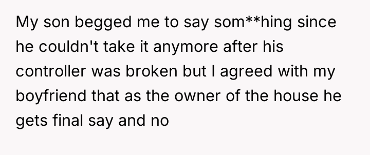 The broken controller incident was the critical point requiring a firm boundary enforcement, not just compensation. While the boyfriend is paying for the damage, this punitive measure addresses the symptom, not the cause (lack of respect for private property). The OP should have advocated more strongly for a negotiated solution, perhaps involving a third-party mediator if the boyfriend remained entrenched. Moving forward, the OP needs to communicate clearly to her boyfriend that respect for personal boundaries is non-negotiable for the long-term health of the family, regardless of past debts or who owns the house. A constructive step would be to revisit the lock discussion, perhaps framing it as a safety measure for personal property rather than an act of defiance against the boyfriend.