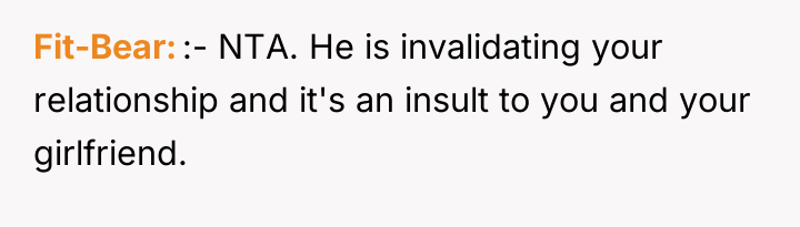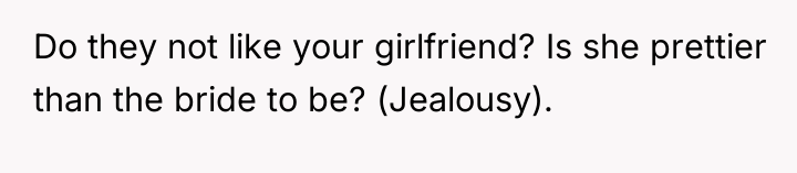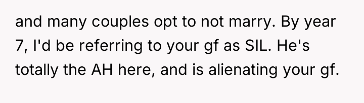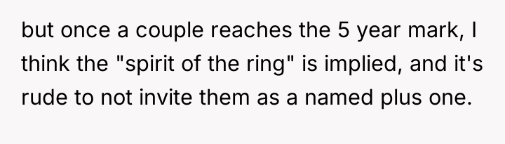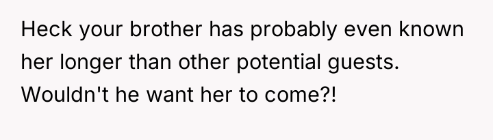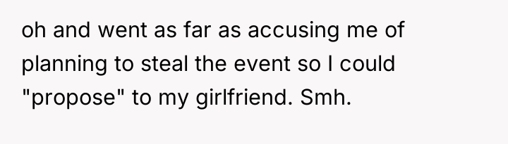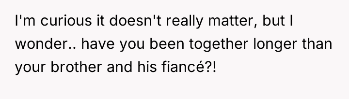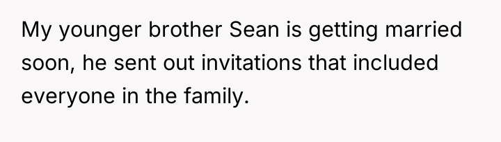 The brother and mother, however, appear to be operating under a different set of social norms or boundaries regarding wedding guest definitions, specifically prioritizing formal legal status (engagement/marriage) over relationship duration. The family's reaction—accusing the OP of trying to 'alter' the event and acting as a controlling father figure—suggests a dynamic where the OP's desire for validation of their partnership directly challenged the brother’s autonomy over his wedding plans. The accusation that the OP intended to steal the spotlight for a proposal further indicates high emotional reactivity and a tendency to catastrophize the OP's motivations.