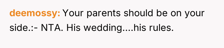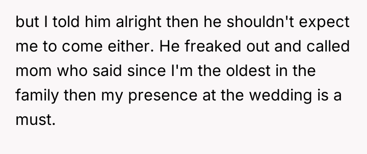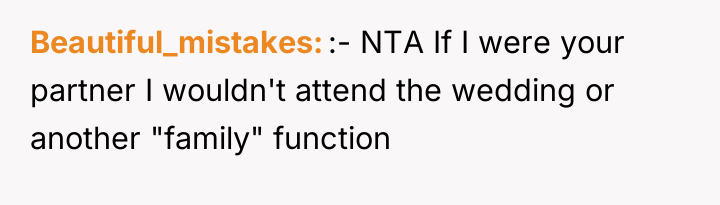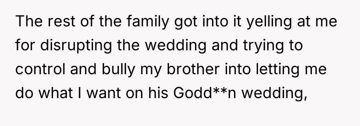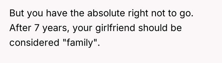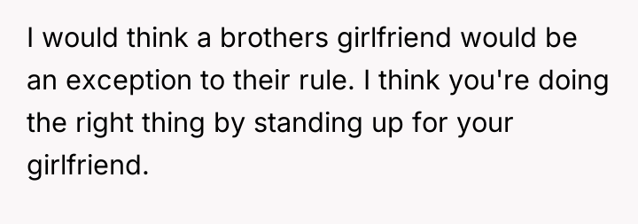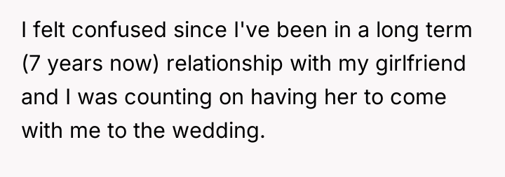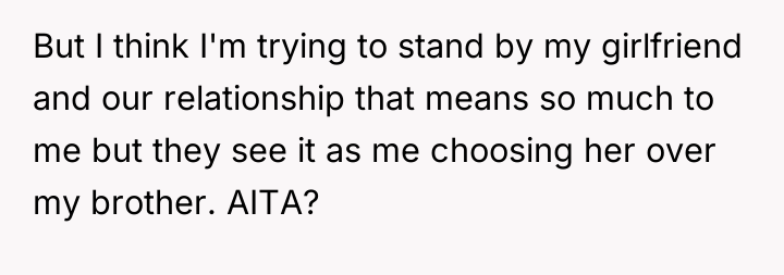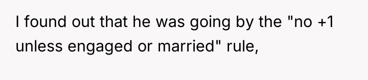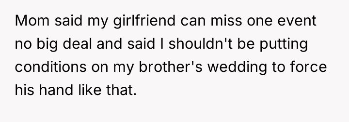 The original poster (OP) faced a significant conflict stemming from their brother's strict 'no plus-one unless engaged or married' policy, which excluded the OP's long-term girlfriend of seven years. The OP's firm insistence that their partner must be invited led to a severe family confrontation, with the OP standing by their commitment to their partner against the expectations of their brother and mother.